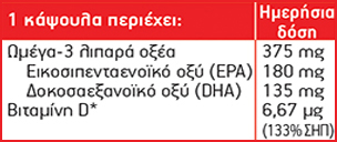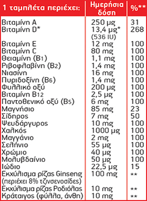 * Συνολική ποσότητα Βιτ. D (D3) σε 1 κάψουλα και 1 ταμπλέτα = 20 μg (800 IU) (400% ΣΗΠ**)