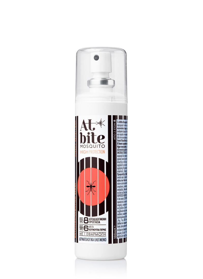 ΟΔΗΓΙΕΣ ΧΡΗΣΗΣ: Εφαρμόστε την απαιτούμενη ποσότητα AtBite Mosquito High Protection ώστε να καλύψετε ομοιόμορφα τα ακάλυπτα μέρη του σώματος, απλώνοντας με τα χέρια (5 ψεκασμοί ανά άκρο). Εφαρμόστε μια φορά ημερησίως. Για να εφαρμόσετε στο πρόσωπο, ψεκάστε μια ποσότητα στις παλάμες και απλώστε προσεκτικά στο πρόσωπο σας ή του παιδιού, αποφεύγοντας την επαφή με τα μάτια και την περιοχή του στόματος. Σε περίπτωση έντονης εφίδρωσης ή μετά από κολύμπι, το προϊόν θα πρέπει να εφαρμοστεί ξανά. Μην εφαρμόζετε πάνω σε ρούχα ή όταν χειρίζεστε τρόφιμα.