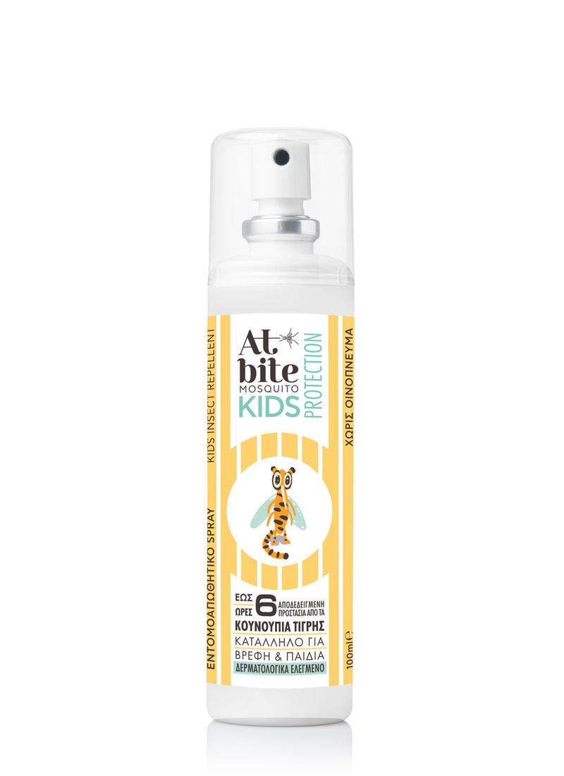 Το εντομοαπωθητικό spray ΑtBite Mosquito Kids Protection για βρέφη και παιδιά έχει σχεδιαστεί ειδικά για την ευαίσθητη βρεφική και παιδική επιδερμίδα χωρίς οινόπνευμα. Περιέχει την εντομοαπωθητική ουσία IR3535 σε περιεκτικότητα 10%, αναγνωρισμένη από τον Παγκόσμιο Οργανισμό Υγείας (WHO) για την ασφάλεια χρήσης και την κλινικά αποδεδειγμένη της δράση, ενώ αποτελεί ένα από τα βασικά μέσα προστασίας από φορείς ελονοσίας, ιού Ζίκα, δάγκειου και κίτρινου πυρετού και chikungunya.